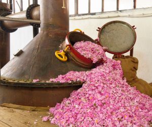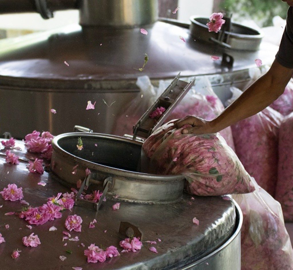 Розовият цвят най-напред се поставя в огромни метални съдове, залива се с вода и се атакува с пара.